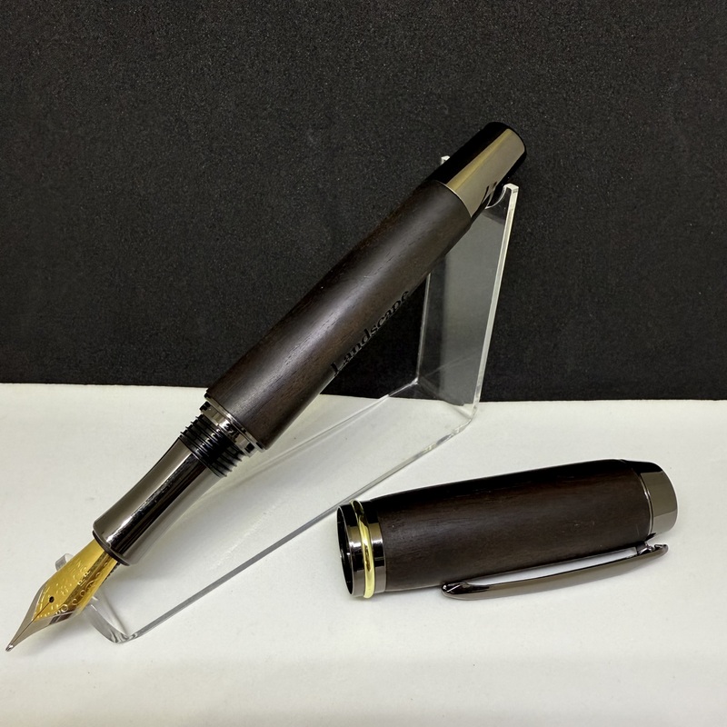 希少木材、ブラックウォルナットを切削加工し軸に採用した万年筆です。