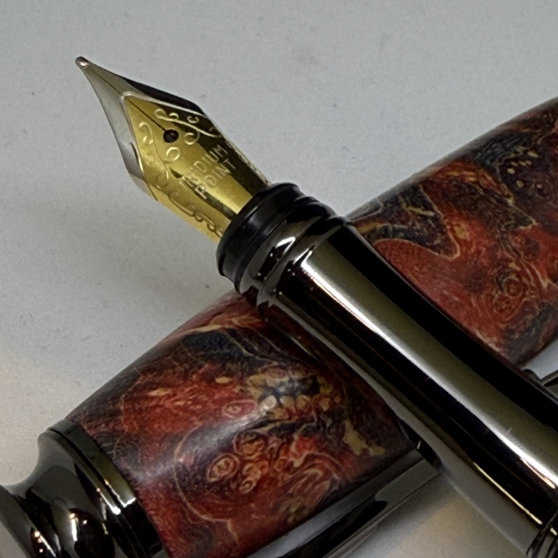 木目の美しいメイプル材に樹脂を含浸させ、気温や湿度の影響を受けにくく経年劣化に強い作りの万年筆です。