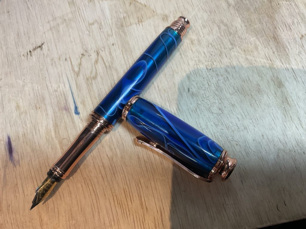 レジン無垢材からの切削加工、軸径は15mmを超える大型サイズ、補強に真鍮パイプを通しておりますので重量感があります。ペン先は高級ステンレス製で中細字相当となります。インクはヨーロッパ標準型カートリッジを使用できます。専用コンバーター付きです。
