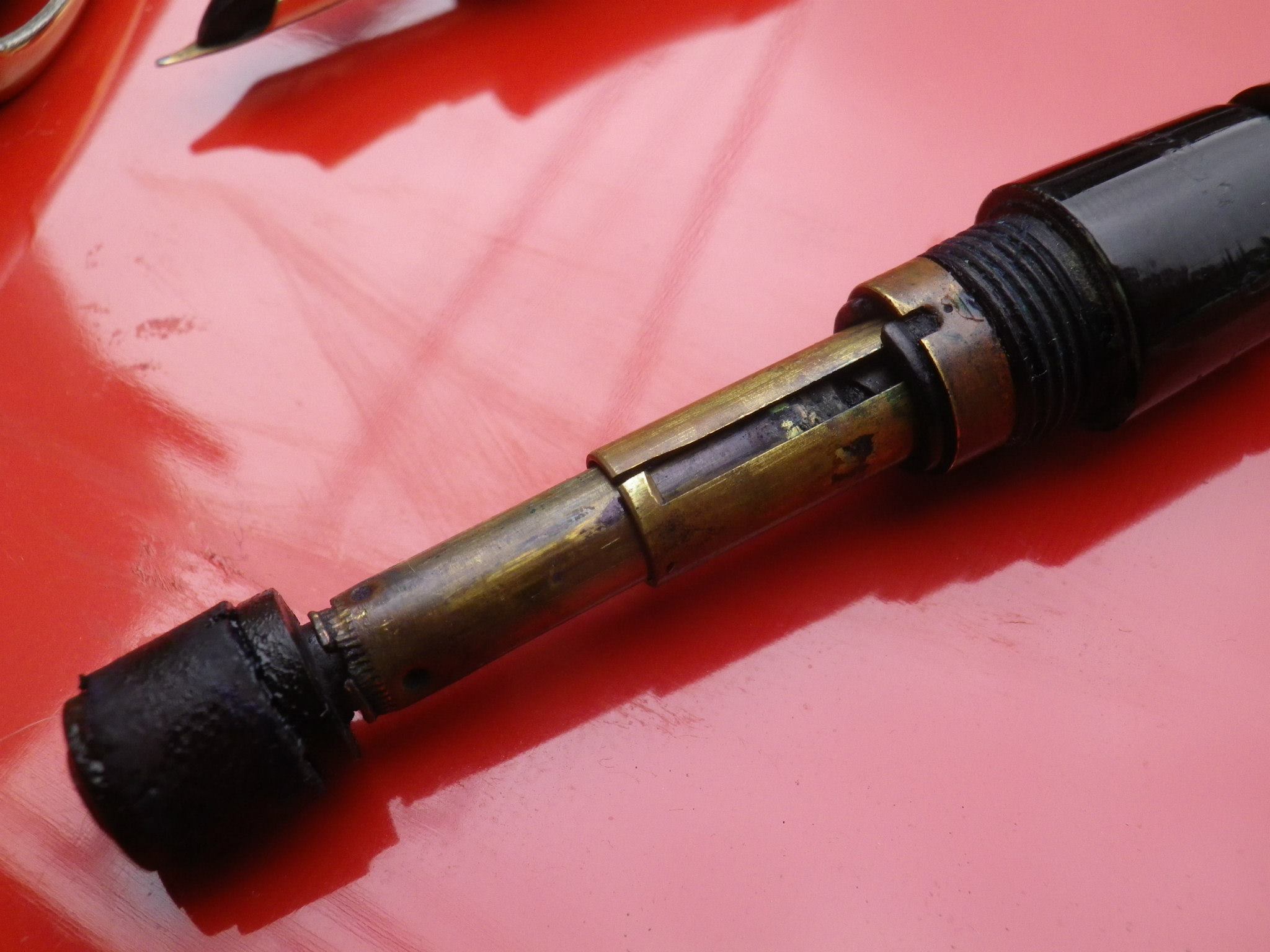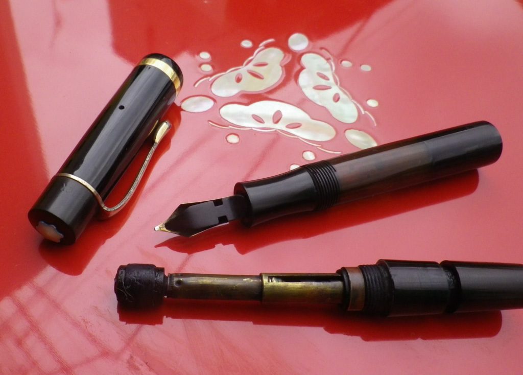 モンブラン#134 投稿日時: 2013-07-25 投稿者: 綾音川窪 #134 #134モンブラン・テレスコピック吸入の修理はコルク交換も含めて¥9000位から、写真の場合は樹脂部やシャフトの破断、クリップとリングの再メッキ含めて¥15000位の見積もりです。 #134テレスコピックのトラブルはコルク劣化によるインク漏れで固まり動かなくなる事、そして無理に回して2段目シャフトが破断します。ストッパーが効かず空転してしまいます。