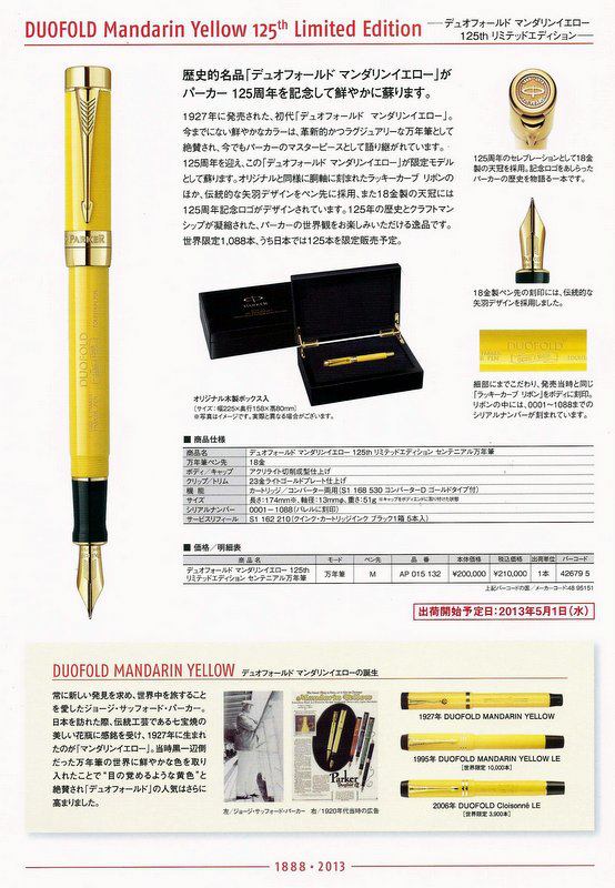 125th Anniversary Mandarin Yellow Parker Duofold 投稿日時: 2013-03-27 投稿者: 綾音川窪 パーカー125周年記念モデル「マンダリンイエロー」 本数極めて少ないですが現時点取り寄せ可能です!http://kawakubo.cart.fc2.com/ca200/1269/p-r-s/