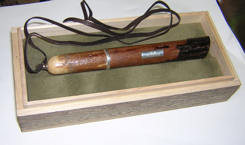 茅葺き屋根の天井に使用され、100年以上の時を囲炉裏で燻された竹を使用しています。煤竹は内部までが燻煙効果による細胞の変質で硬化されており、堅牢で耐久性が高くなっておりますので、ほぼ手磨きだけの仕上げ処理に留めております。両端部には希少材ブラックウォルナットを象眼しており、素材違いのコントラストを愉しんで頂けるかと思います。節の部分を薄い刃で切り落とし、高度なセンター合わせ処理を施しましたので、収納時には加工前の姿に完璧に復元します。