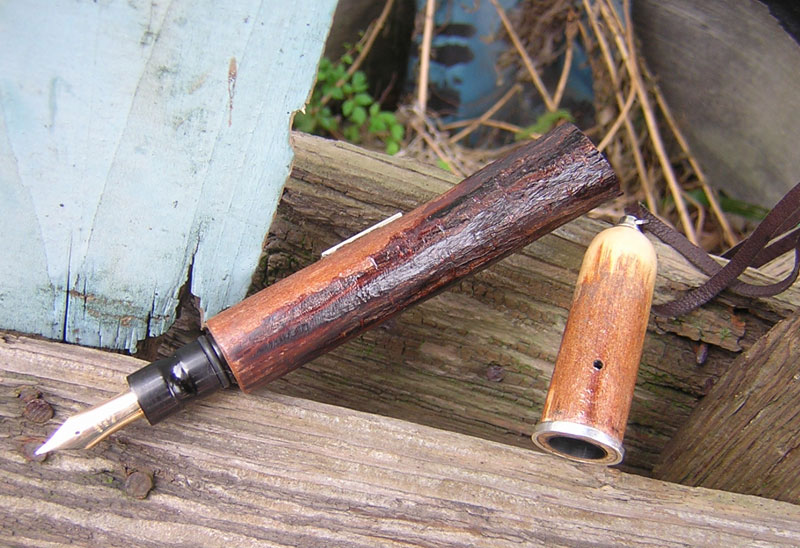 太く成長することが希な南天の幹を、自然な「姿」のまま万年筆にしてみました。強度的にも堅牢で密度が高く、万年筆の軸材としても優れた可能性を持っています。独特な縦の畝模様の樹皮はニトロセルローズにて完全コーティングし永続性を持たせました。またキャップと軸は連続しおりますので、収納時は見事な天然オブジェと化します。ペン先は18金を使用しています。南天は金閣寺の茶室の床柱に使われていることで有名ですが「難が転じて福となす」という、大変に縁起の良い天然素材でもあります。